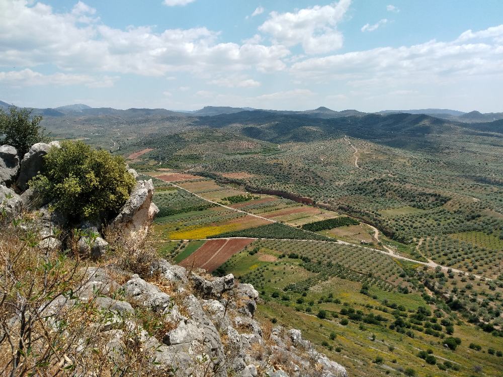 The acropolis of Midea and its important Late Bronze Age citadel is located on a 270 m tall conical hill in the Argolid, 1.5 km from the contemporary cemetery at Dendra and about midway between Tiryns and Mycenae. From the top of the hill, looking south and west the site offers a magnificent view of the Argive plain and gulf. To the north and east the tall inland mountains dominate the landscape. This view, making it possible to monitor the plain and its approaches, possibly contributed to the importance of the site during the Bronze Age.