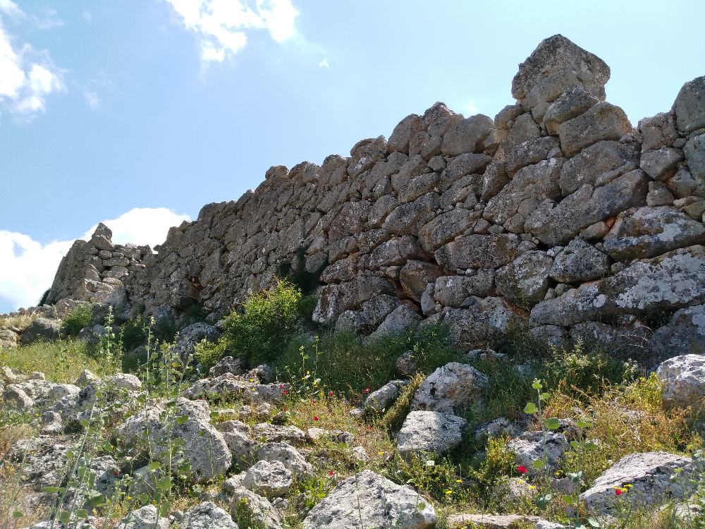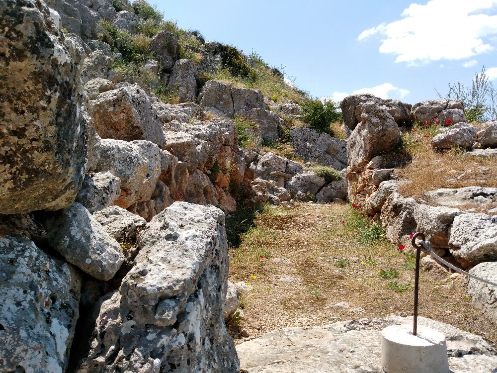 Both the East and West gates were monumental structures. The former was the main entrance to the acropolis, accessed by a large cyclopean ramp. The West Gate was constructed by the fortification wall on the west side and cut into the living rock of the Upper Acropolis to the east. The wide entranceway was provided with a guardroom, located in the wall, as well as a massive bastion protecting the outer face. The much smaller sally port consisted of a thin covered passageway running slightly obliquely through the 5.70 m thick wall. At some point in time this exit was blocked and the outer face of the wall repaired in a different masonry style.