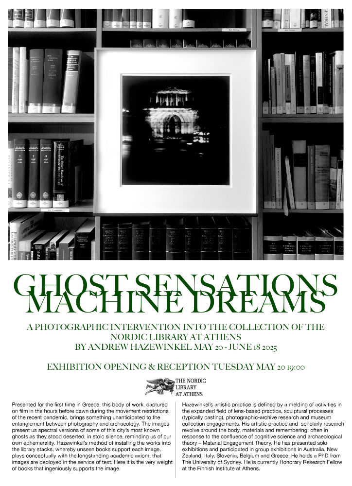 The Nordic Library at Athens invites you to the exhibition Ghost Sensations / Machine Dreams, a photographic intervention by Andrew Hazewinkel into the collection of the Nordic Library at Athens, on view from 20 May to 18 June 2025.