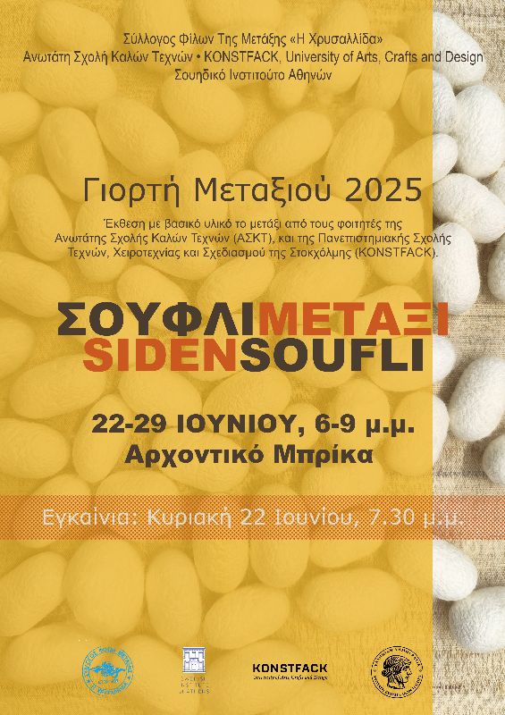 The Swedish Institute at Athens, KONSTFACK, the Athens School of Fine Arts (ASFA), and the Association of Friends of Silk warmly welcome you to the exhibition “Silk & Soufli”, which opens on Sunday, June 22 at 19:30 at Mansion Brika in Soufli.