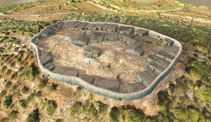 Fig. 5: 3D-rekonstruktion av bosättningen strax efter att befästningarna konstruerats samt hushållsstrukturer, en central (administrativ?) byggnad, ett möjligt begravningsmonument och terrasser.